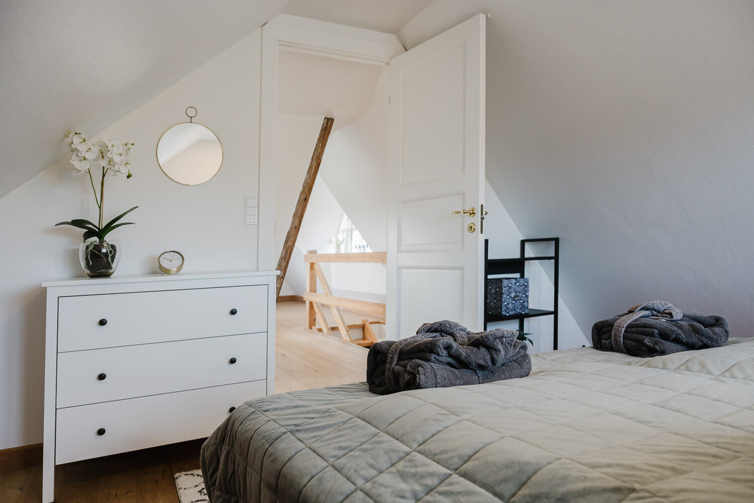 1 x dobbeltseng 90 x 200 cm, der kan flyttes til 2 stk. enkeltsenge. Puder og dyner til 2 pers.